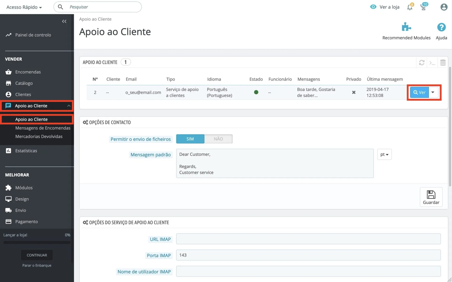 Esta secção permite a configuração do site ao seu servidor de email através do IMAP. Deverá certificar-se de que todos os campos estão devidamente preenchidos, de forma a que a ferramenta de atendimento ao cliente funcione corretamente (grande parte destas informações deverá ser fornecida pelo seu host).