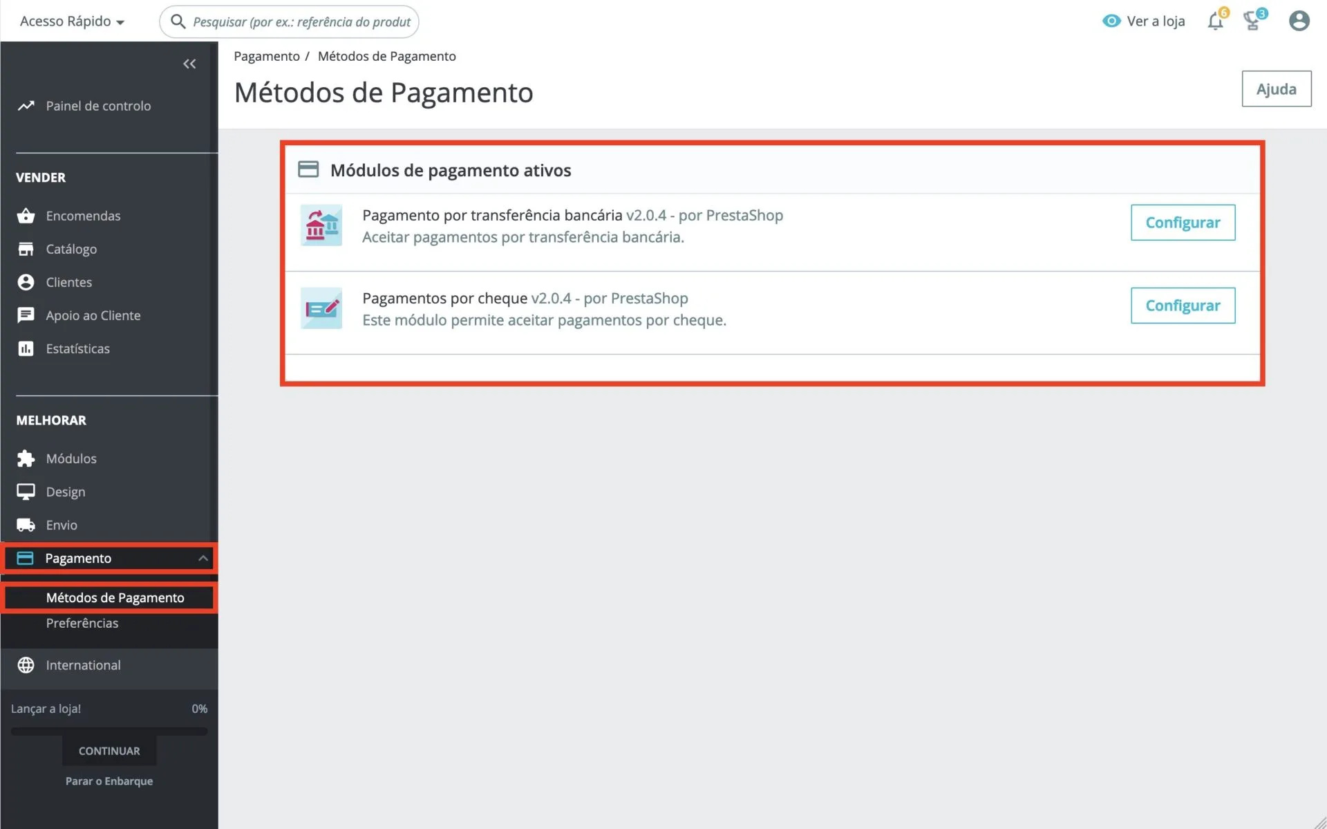 1. Aceder a Pagamento > Métodos de Pagamento. Esta página irá apresentar os métodos de pagamento atualmente ativos na sua loja, sendo que para os configurar apenas tem de clicar no botão Configurar.